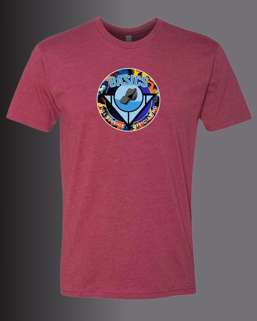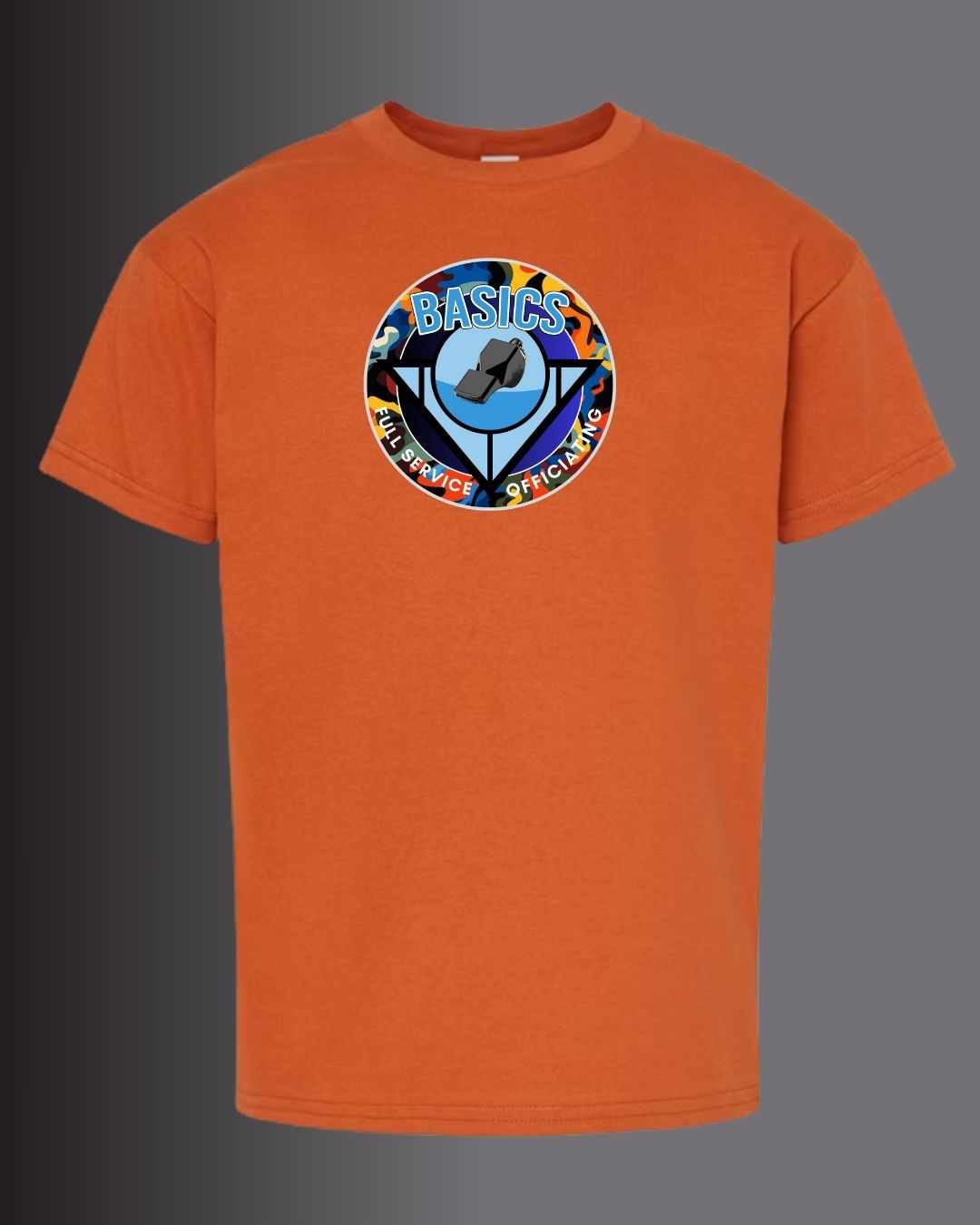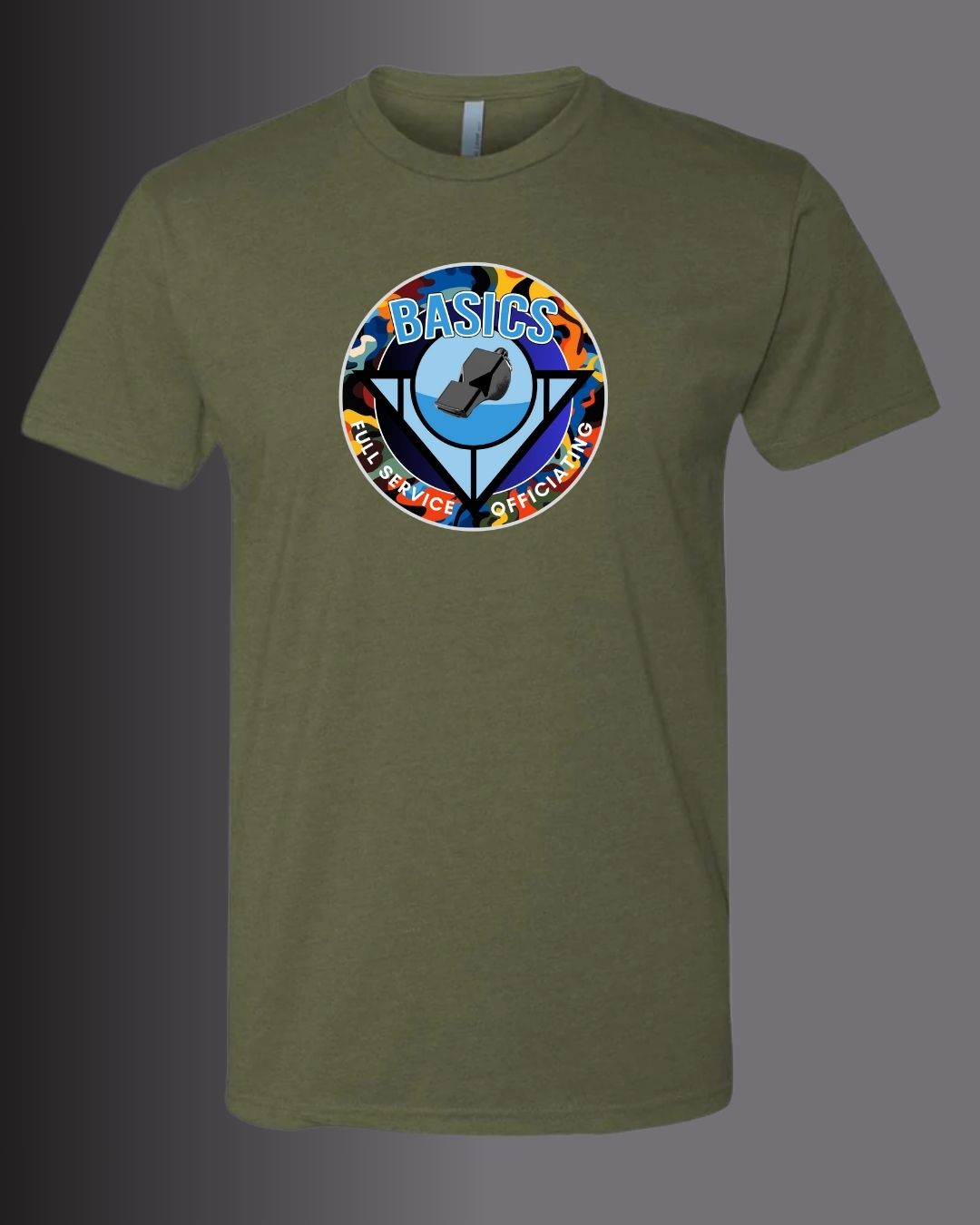 Stand out with purpose in the official BASICS Referee School crew neck tees. This ultra-soft, premium cotton-blend shirt features a bold front logo celebrating officiating, centered with a whistle over a court graphic surrounded by vibrant camo-style accents.